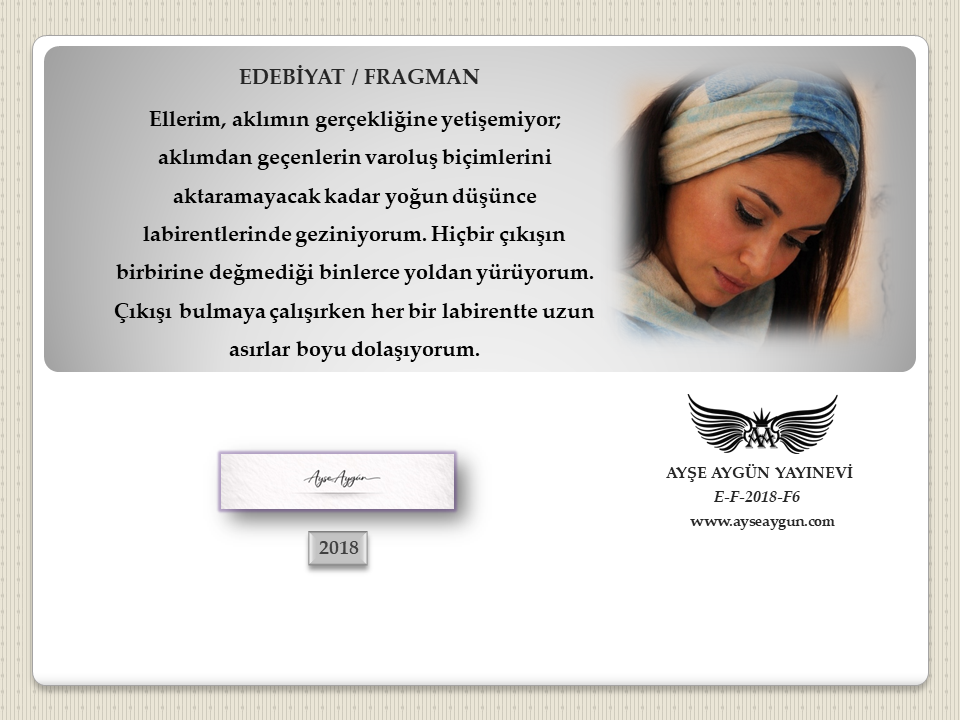 Ellerim, aklımın gerçekliğine yetişemiyor; aklımdan geçenlerin varoluş biçimlerini aktaramayacak kadar yoğun düşünce labirentlerinde geziniyorum. Hiçbir çıkışın birbirine değmediği binlerce yoldan yürüyorum. Çıkışı bulmaya çalışırken her bir labirentte uzun asırlar boyu dolaşıyorum.