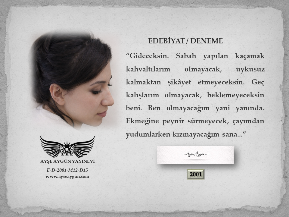 Gideceksin. Sabah yapılan kaçamak kahvaltılarım olmayacak, uykusuz kalmaktan şikâyet etmeyeceksin. Geç kalışlarım olmayacak, beklemeyeceksin beni. Ben olmayacağım yani yanında. Ekmeğine peynir sürmeyecek, çayımdan yudumlarken kızmayacağım sana.