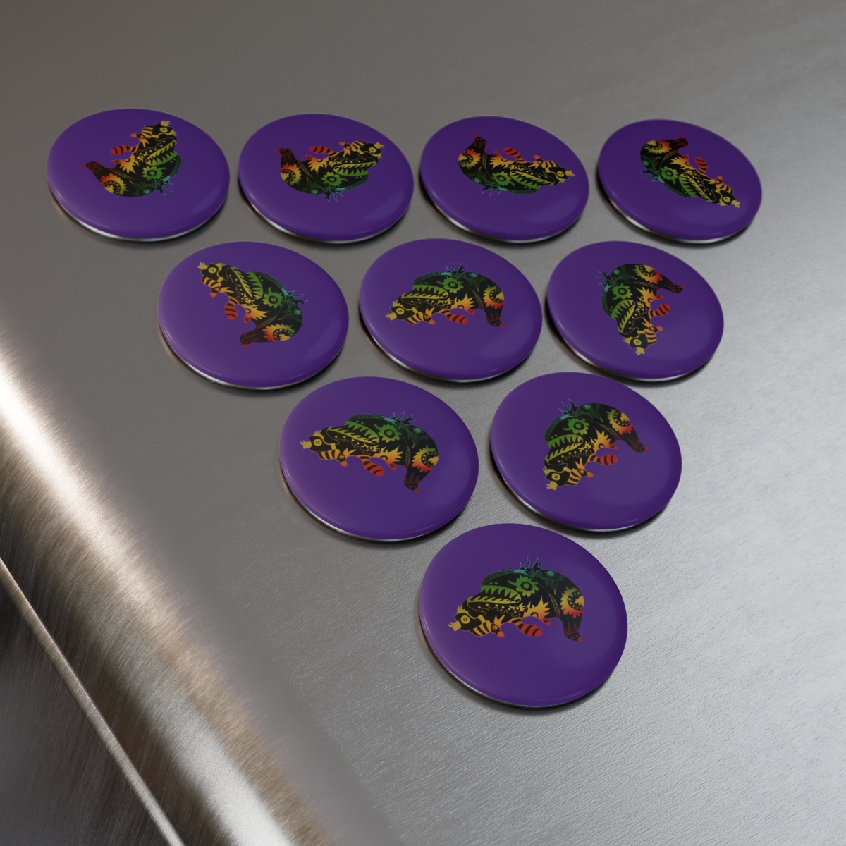 MAGNET Add a touch of character on any metal surface with these personalized magnets. Available as 1-packs or 10-packs, these round magnets feature a metal shell front with a magnetic backing. On the front, where your custom design goes, you'll find a clear mylar/UV cover that protects against fading and scratches. .: Metal shell with flat, magnetic backing.: One size (2.25") (5.7cm).: Clear mylar/UV cover for fading and scratch protection.: Available in 1 and 10 pieces